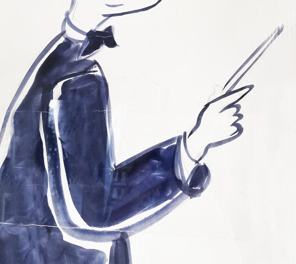 蝶ネクタイで正装し、指揮棒を持った