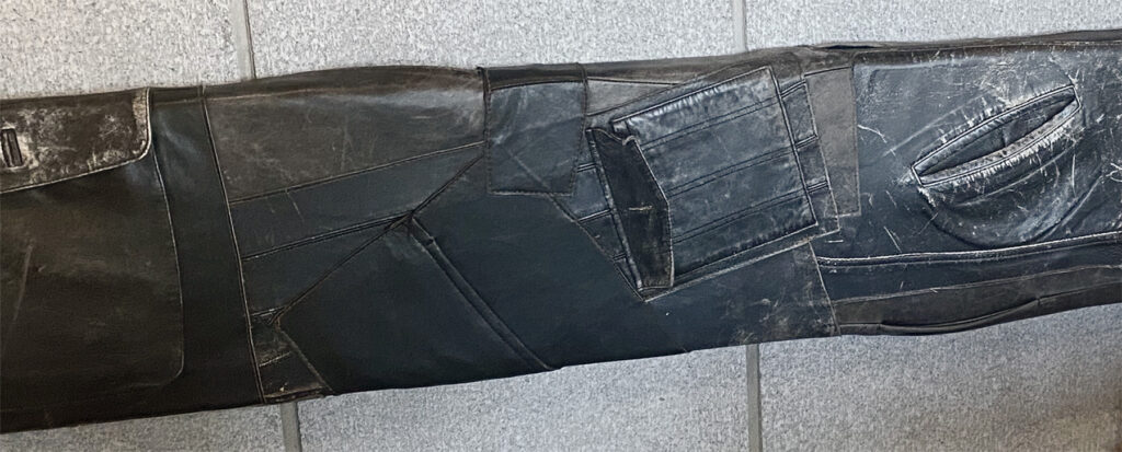 カフェのベンチ席の背もたれに古い革ジャケットをリメイクしたものを張り込んで使用しています。