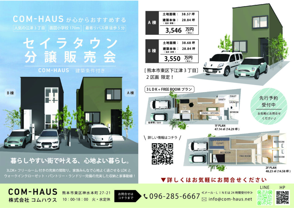 熊本市東区下江津のセイラタウン内にて建築中の、コムハウスが手掛ける新築建売住宅。