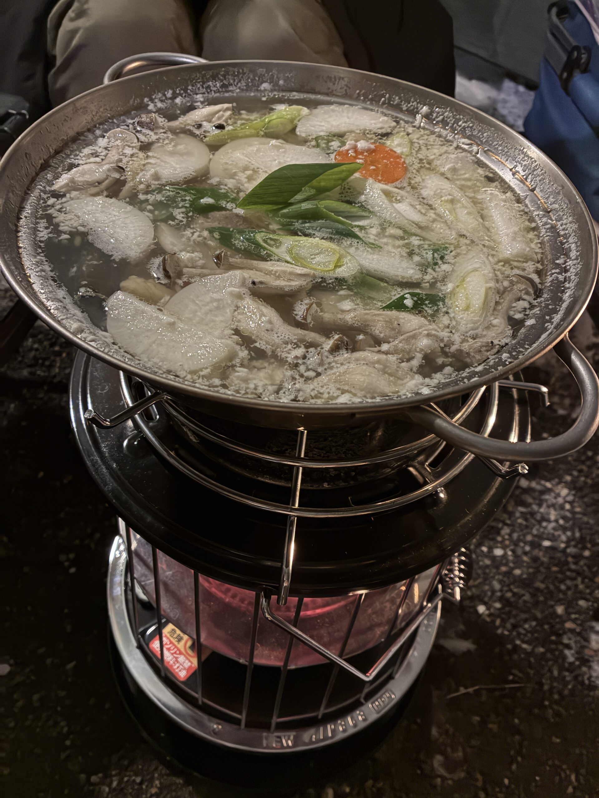 シェルター内はストーブで温め、ご飯はお鍋で体を温め、