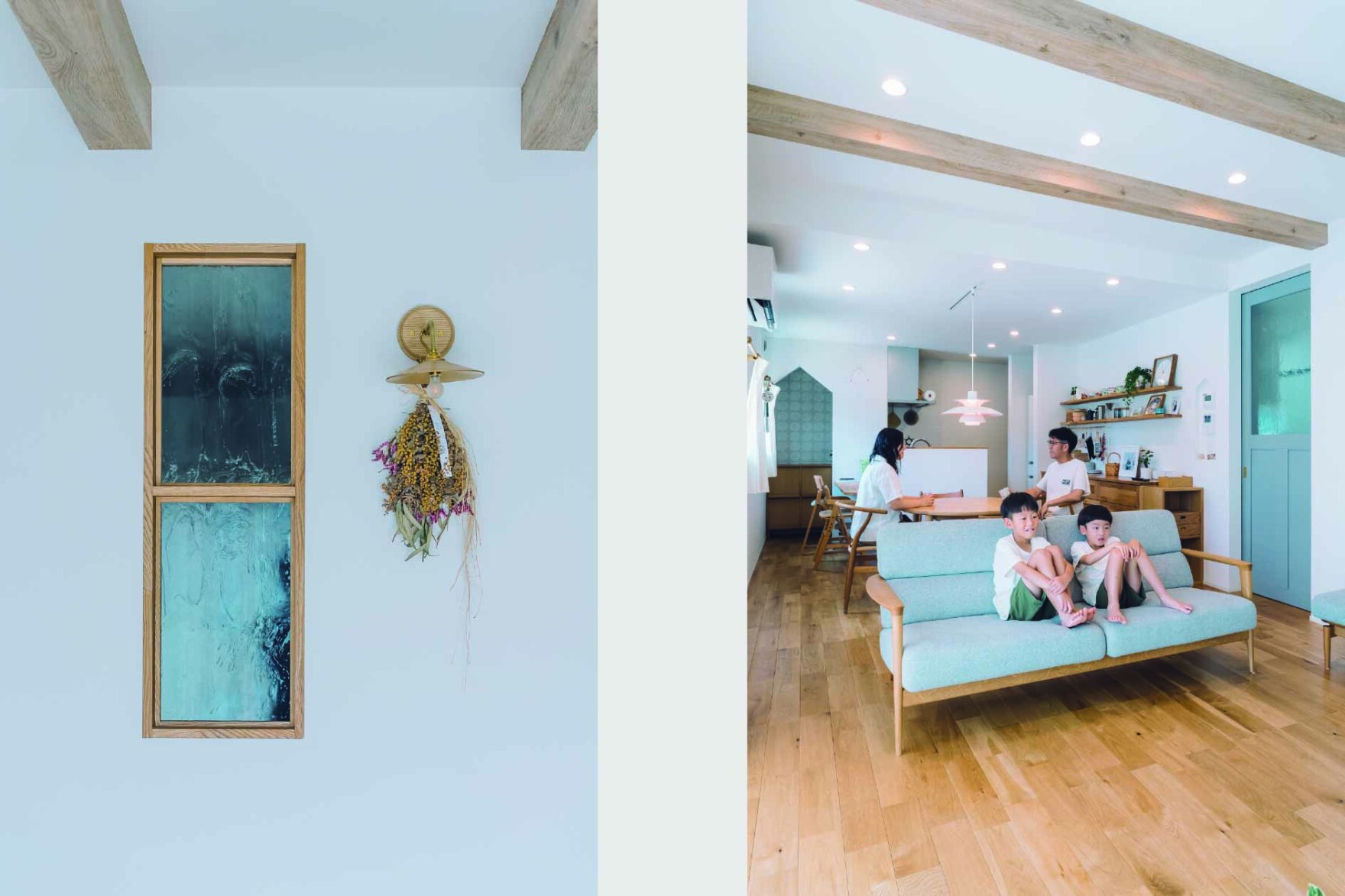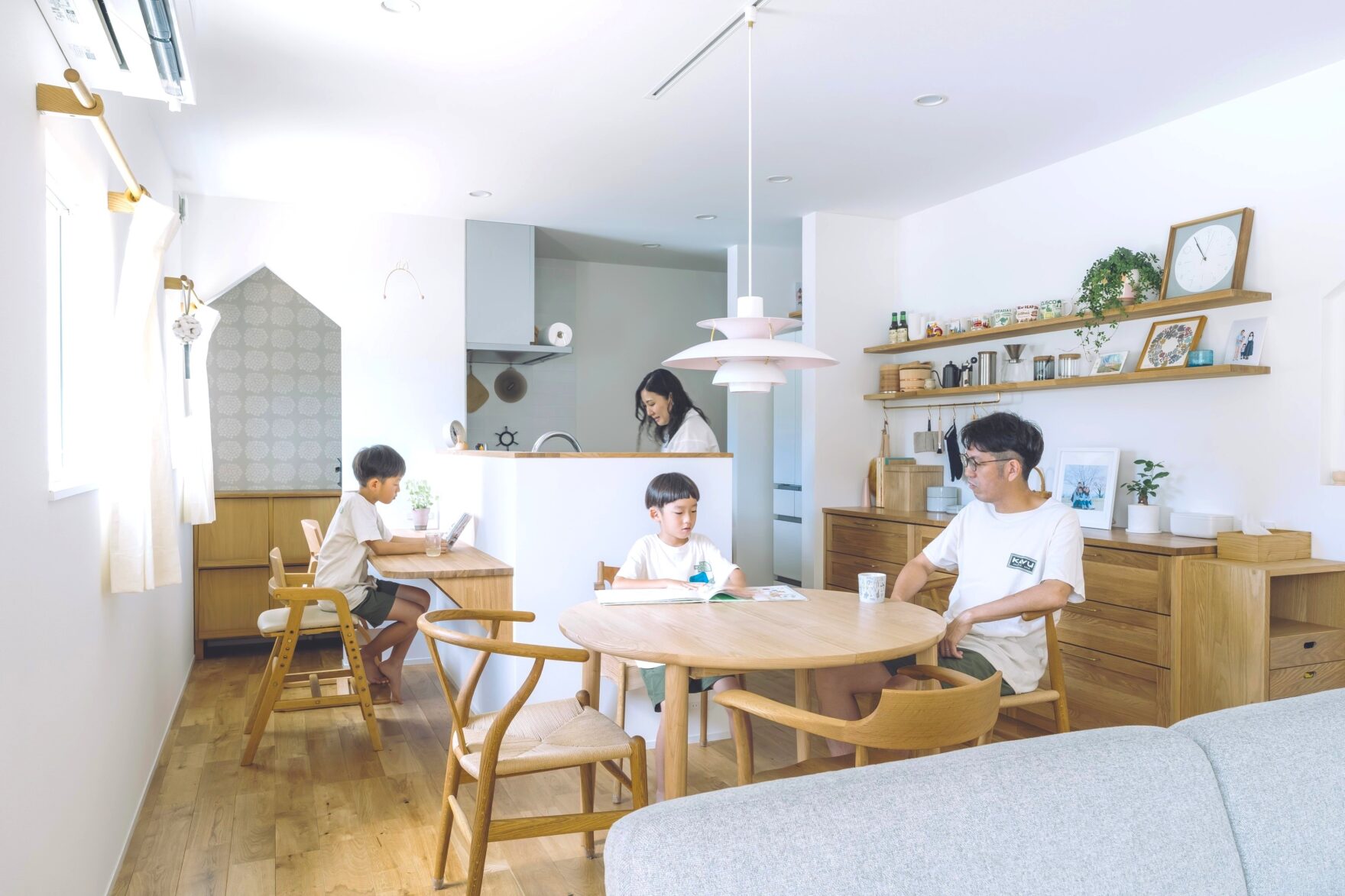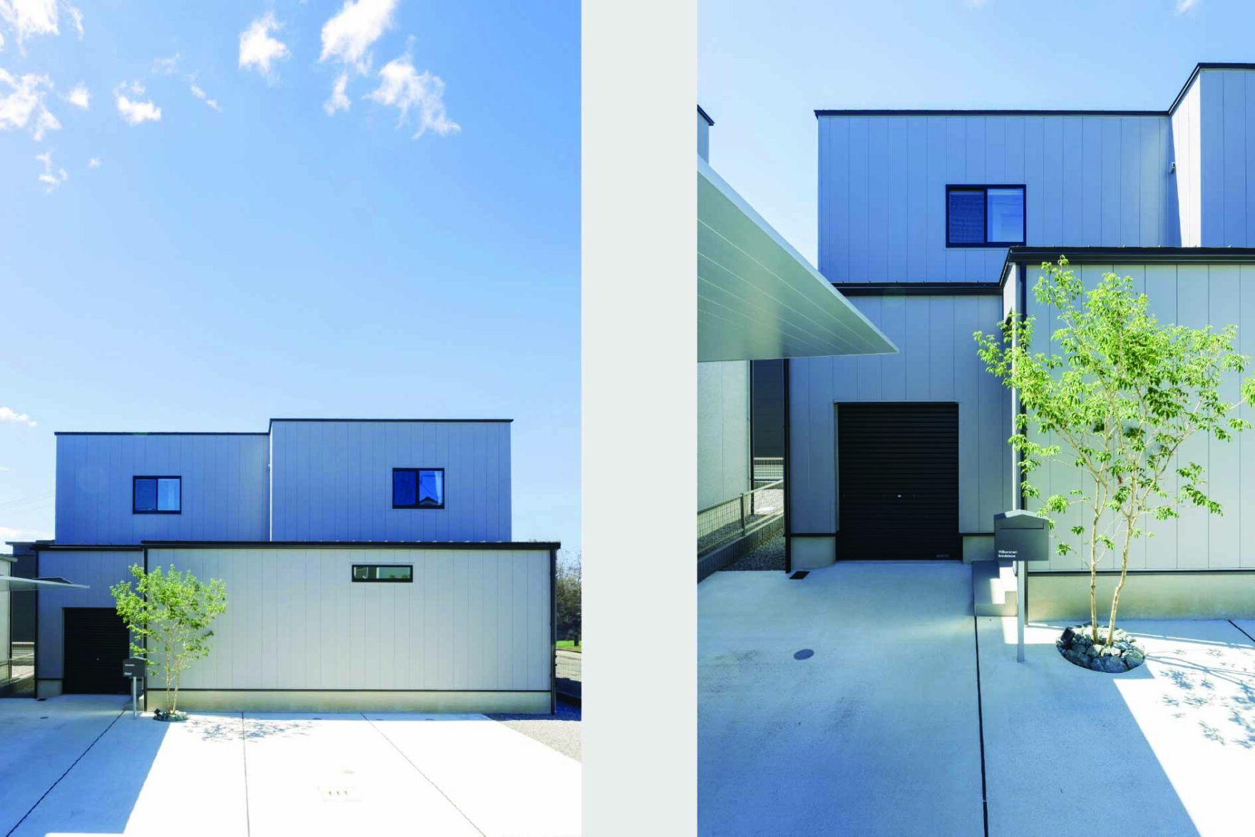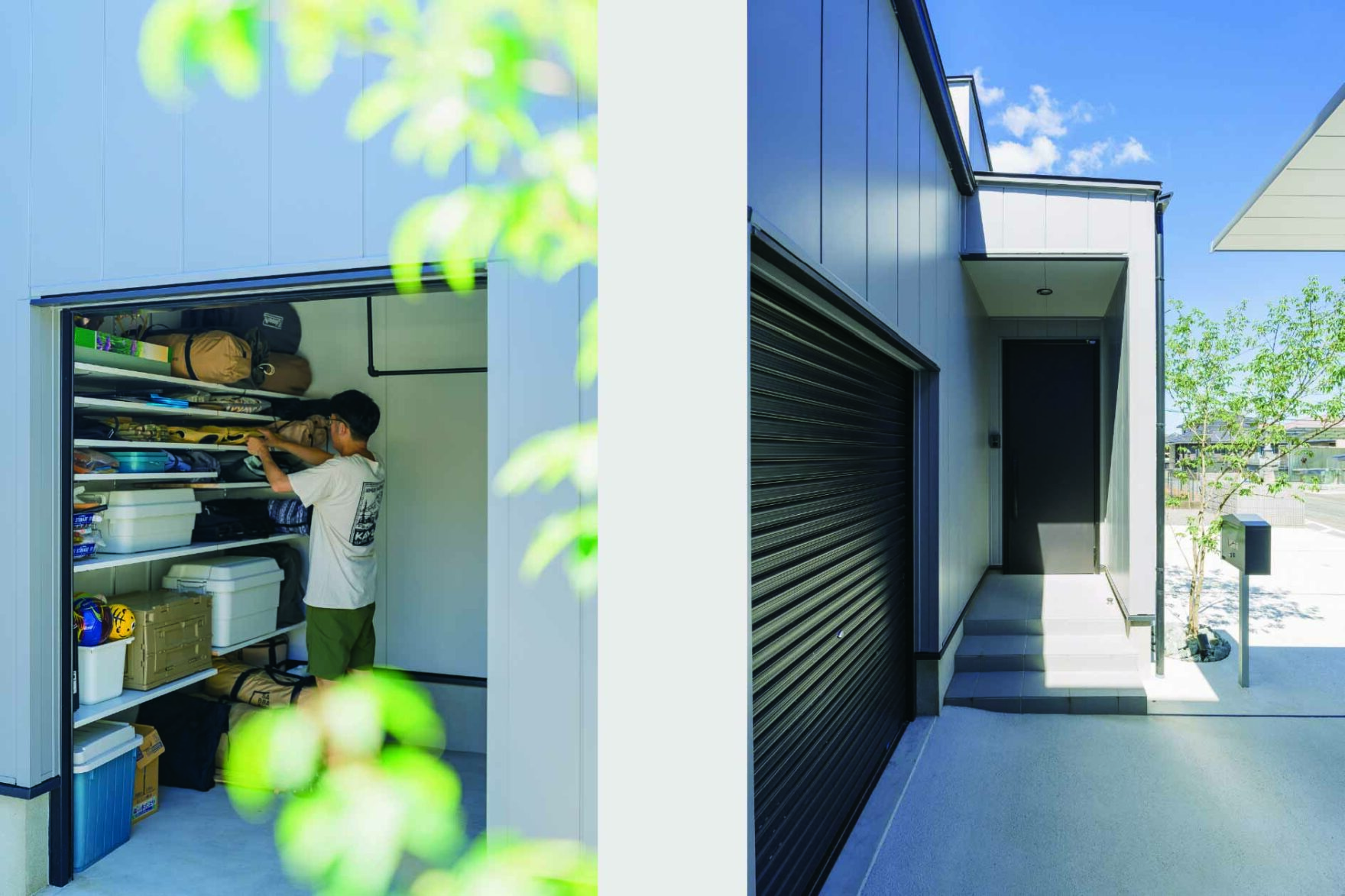 家族の趣味のキャンプを最大限に楽しむ為のガレージのある住まい。 ガルバリウムの素材が生きるシンボリックな外観。 インテリアはこだわって丁寧にセレクトされた 家具や道具が彩る、心地よく、毎日が楽しくなる暮らし。