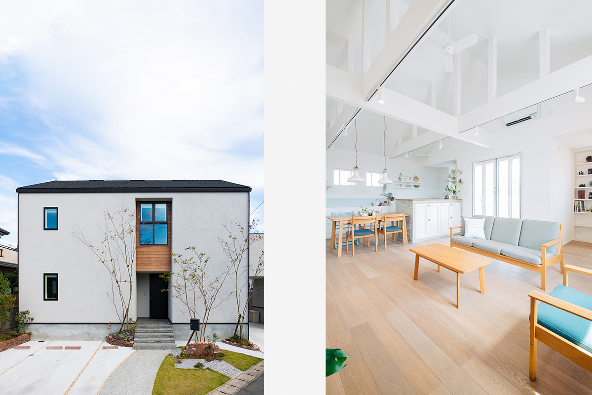 ナチュラルなインテリアの中に、アンティークで揃えた照明やパーツを取り入れ、新築ながらも暮らしていたかのような空間に。2世帯の家族が忙しい中でも心地よく暮らせるようにこだわった間取りと、開放的な吹き抜けの明るい2階リビング。リビング横には子供達の気配を感じながら勉強ができるスタディルームや広い洗面室やお風呂も設けて家事動線も重視。