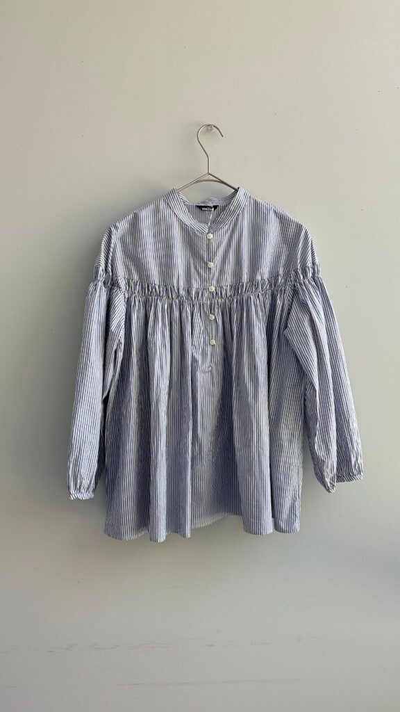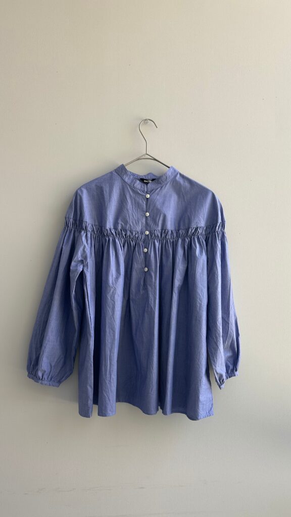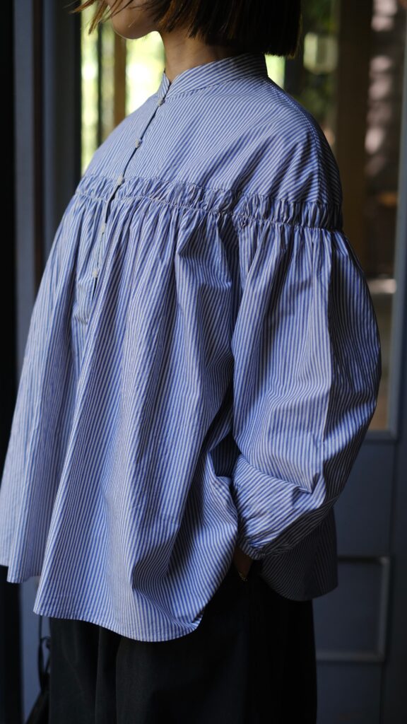 フレアーシルエットのギャザーシャツ。